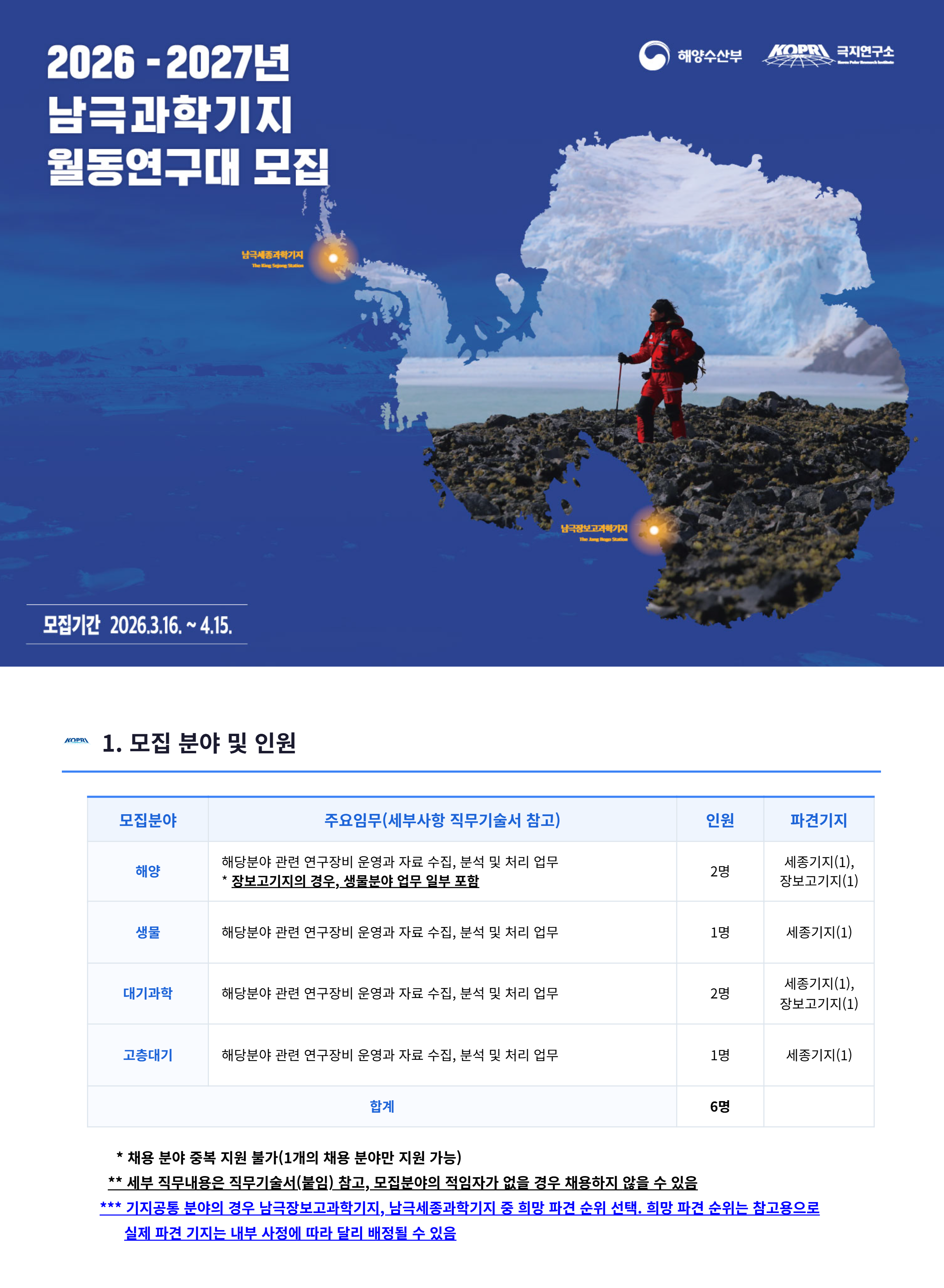- 공고 : 2026년 남극과학기지 월동연구대 채용(연구직)