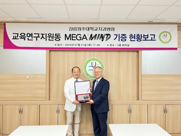 강릉원주대학교치과병원(병원장 박찬진)은 지난 7월 31일, 교육‧연구지원동 내 ‘메가마인드(MEGA’MIND)’ 개소식을 개최했다. 이번 공간은 ㈜메가젠임플란트(대표이사 박광범)의 후원으로 조성되었으며, 교육‧연구지원동 내 첨단 강의시설과 원내생의 학습 편의를 위한 대기공간 등으로 구성되었다.