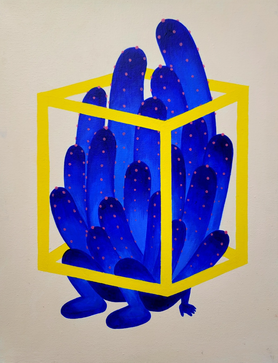 "작업 주제는 콤플렉스를 계속 마주하며 스스로를 치유하는 과정이다. 평소 피부 상태를 외면하다가 상태가 악화되면 콤플렉스를 다시 깨닫게 되는 과정에서 더욱 큰 스트레스를 받아왔다. 이 주제가 정해질 때 피부는 외면할 수 없을 정도로 악화된 상태였다. 스트레스에서 벗어나기 위해 그림으로 피부를 표현하며 콤플렉스를 마주하기로 결심했다. 피부에 가시가 박힌 것 같은 따가움이 느껴졌고 움직일 때마다 갈라지는 것이 보였다. 따가움은 선인장과 가시로, 갈라지는 피부는 사막으로 표현했다."