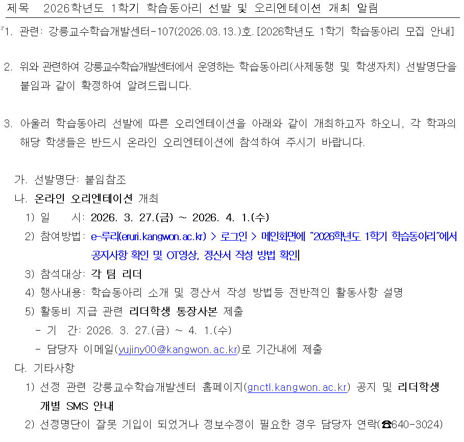 2026학년도 1학기 학습동아리 선발 및 오리엔테이션 개최 알림