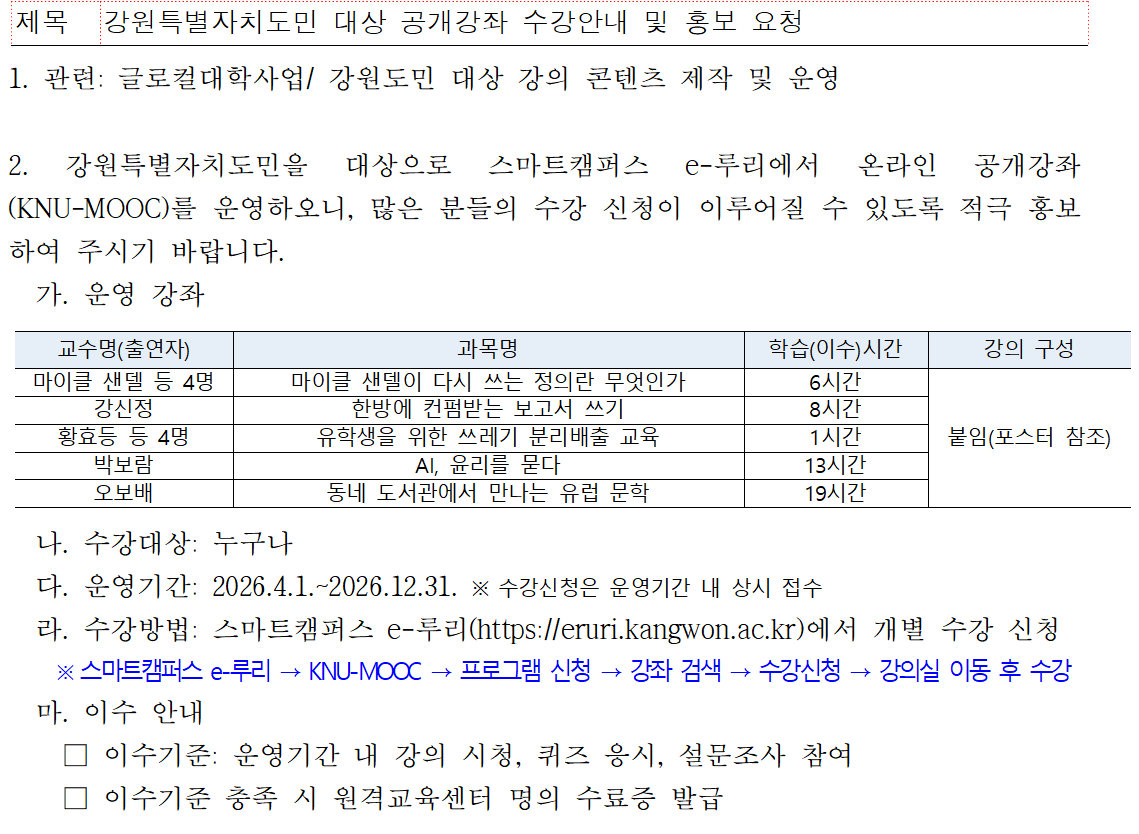강원특별자치도민 대상 공개강좌 수강안내 및 홍보 요청