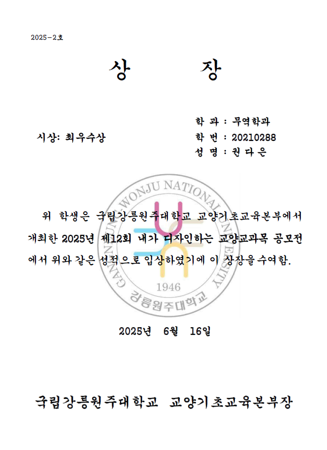 교양기초교육본부에서 진행한 제12회 내가 디자인하는 교양교과목 공모전에서 전공과 인문학을 연계한 “무역과 역사의 흐름: 바다에서 미래까지“라는 주제로 21학번 권다은 학생이 '최우수상'을 수상하였습니다