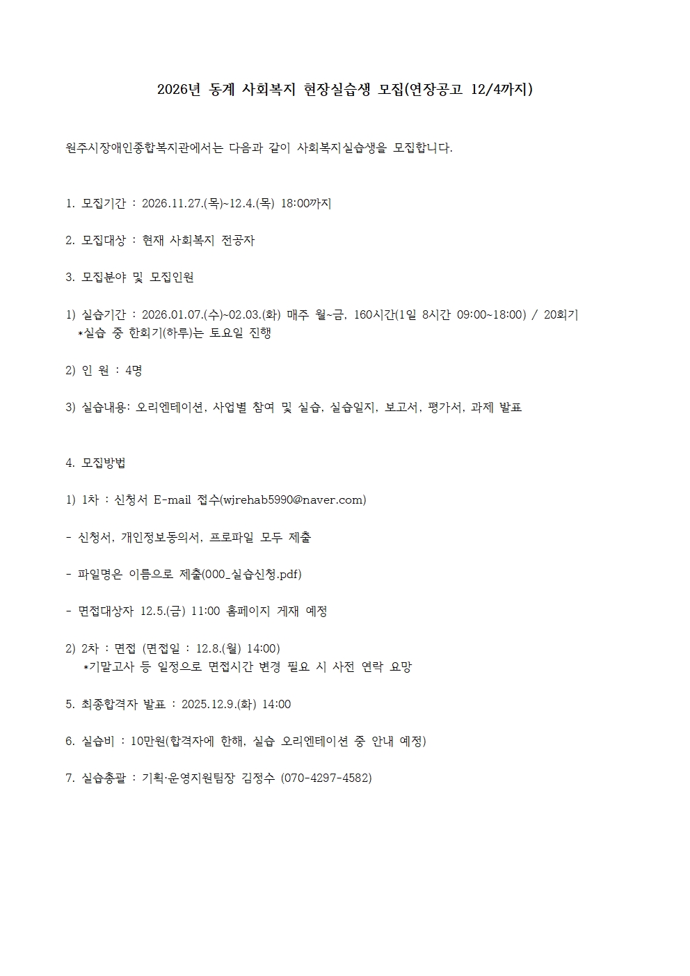 [2026-동계] 원주시장애인종합복지관 실습생 모집 연장 안내(~12/4)