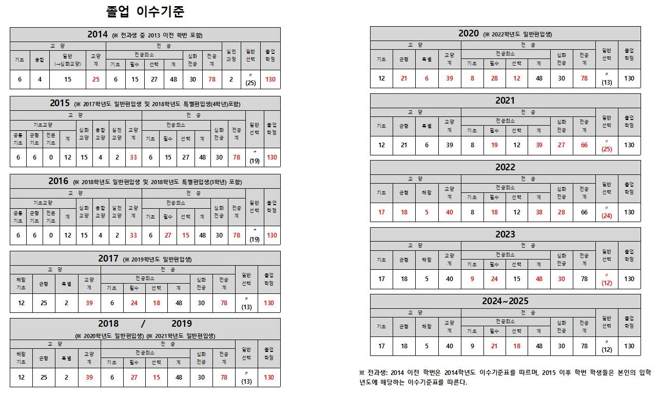 졸업 이수기준표 (2014~2025학번)