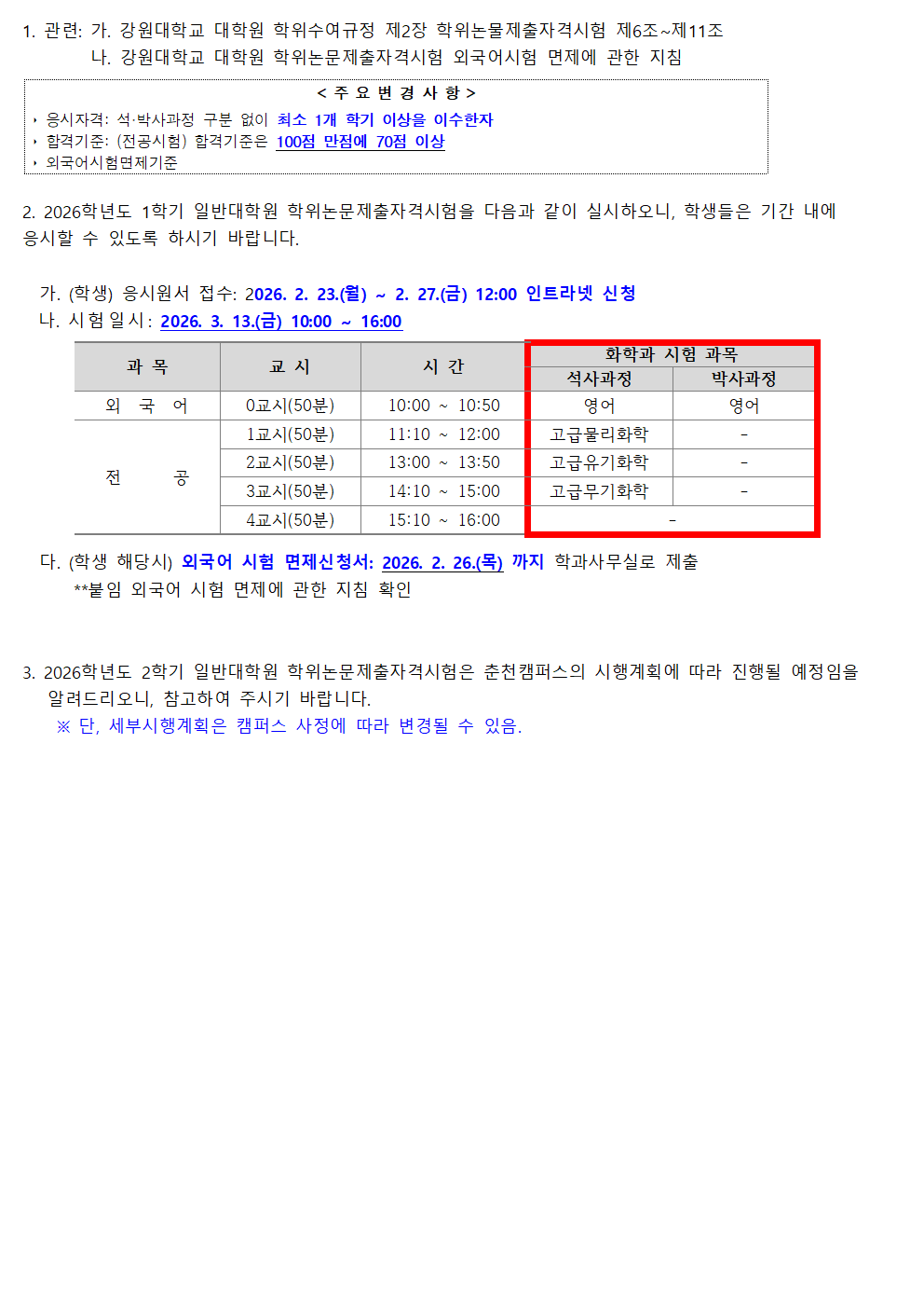 fnctId=bbs,fnctNo=562 [대학원] 2026학년도 1학기 일반대학원 학위논문제출자격시험 실시 안내 작성일 2026.02.19 작성자 진미영 조회수 762 첨부파일 논문제출자격시험 신청 매뉴얼(학생용).pdf 2026학년도 1학기 일반대학원 논문제출자격시험 시행 계획.hwp 강원대학교 대학원 학위논문제출자격시험 외국어시험 면제에 관한 지침(공지용).hwp 각종서식(외국어시험 면제신청서).hwp