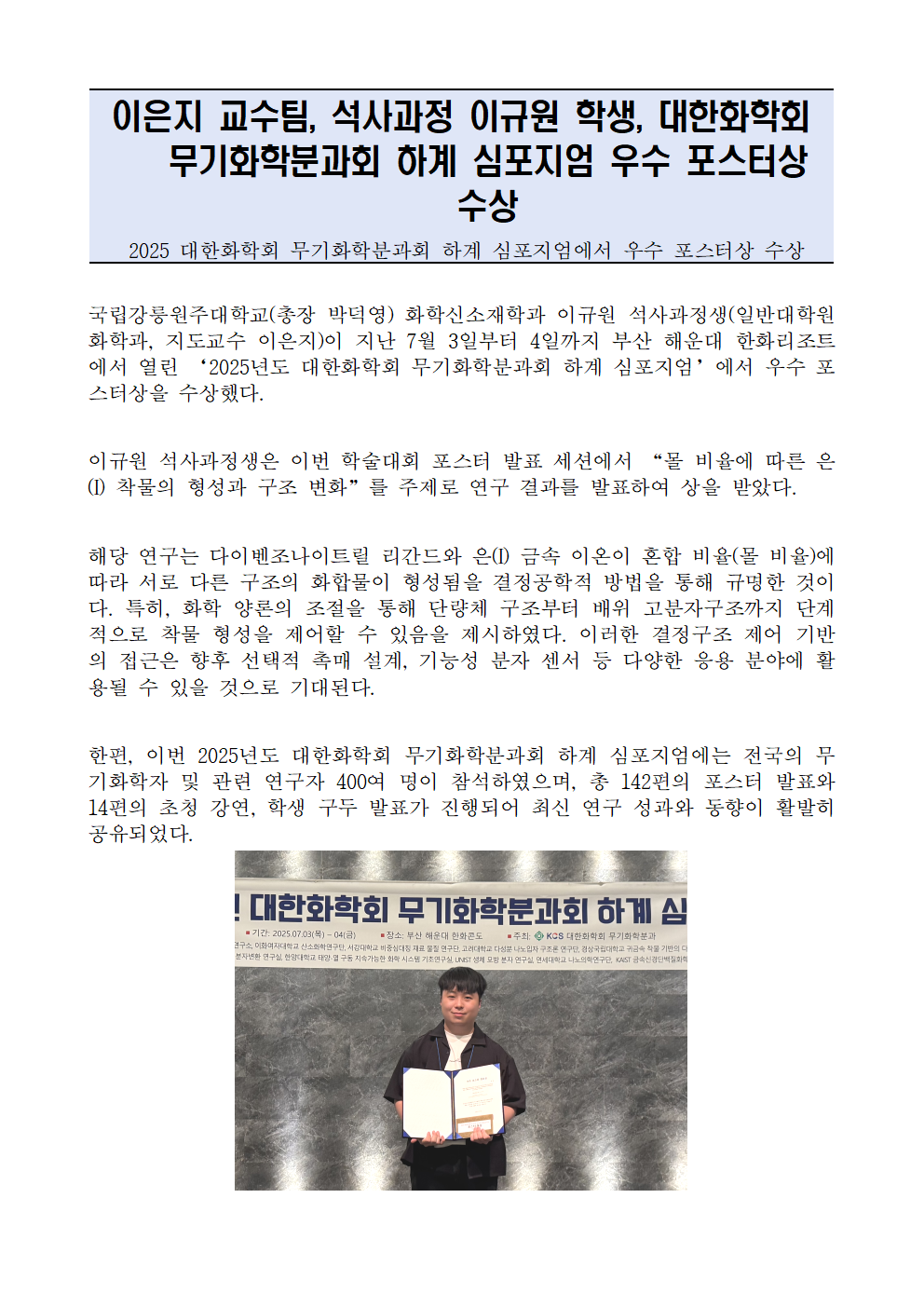 fnctId=bbs,fnctNo=990 이은지 교수팀, 석사과정 이규원 학생, 대한화학회 무기화학분과회 하계 심포지엄 우수 포스터상 수상 작성일 2025.07.08 작성자 진미영 조회수 2192 첨부파일 첨부파일이(가) 없습니다.