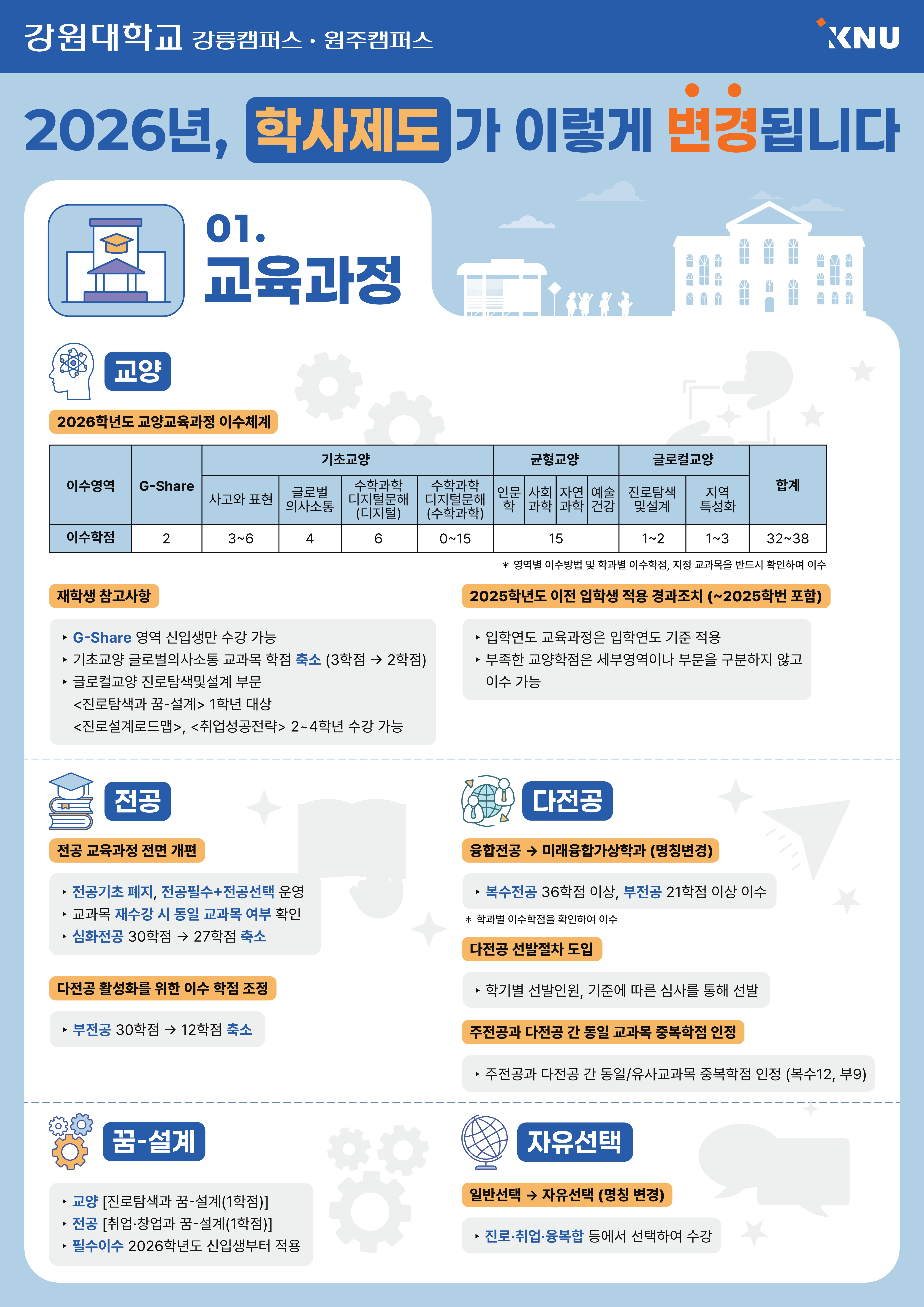 fnctId=bbs,fnctNo=712 2026학년도 통합 강원대학교 교육과정 및 학사제도 안내 작성일 2026.03.18 작성자 김예은 조회수 163 첨부파일 첨부파일이(가) 없습니다.