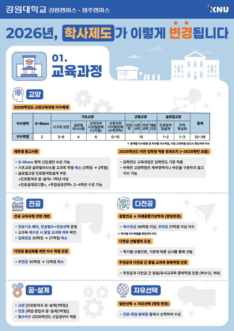 fnctId=bbs,fnctNo=880 통합 강원대학교 교육과정 및 학사제도 안내 인포그래픽 배포 작성일 2026.02.27 작성자 홍승연 조회수 749 첨부파일 첨부파일이(가) 없습니다.