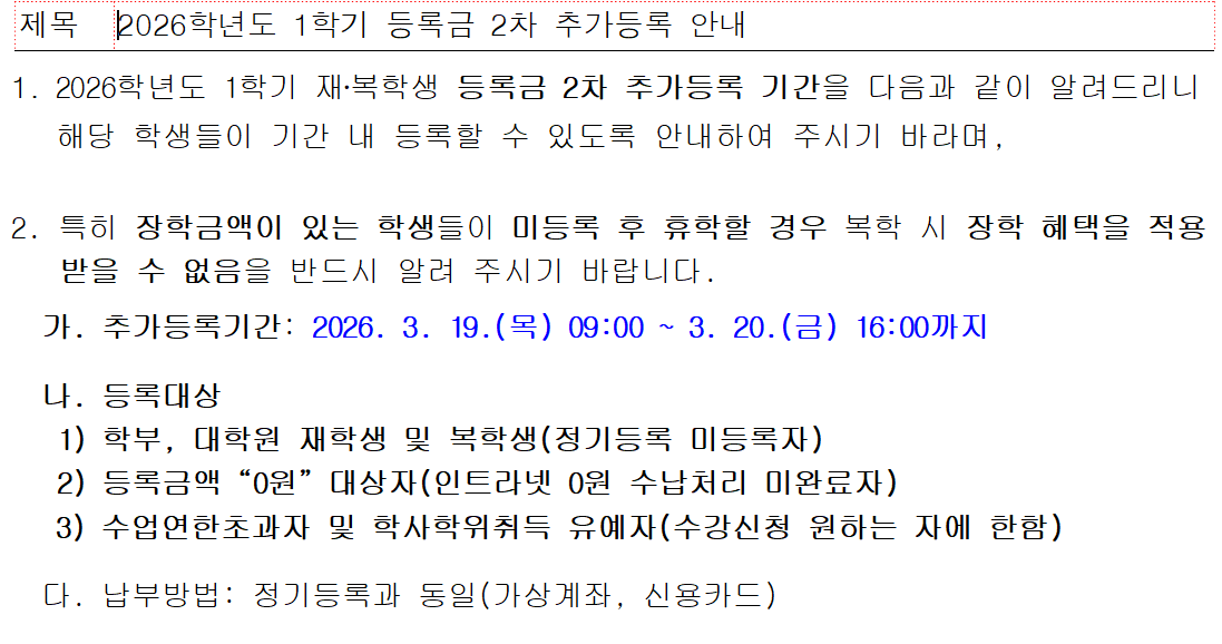 2026학년도 1학기 등록금 2차 추가등록 안내