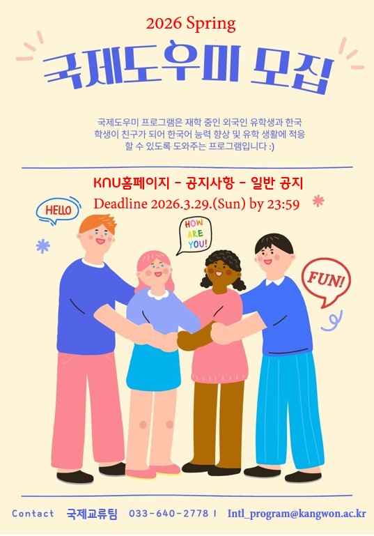 fnctId=bbs,fnctNo=881 [KNU 글로벌 메이트] 2026학년도 1학기 국제도우미 모집 안내 작성일 2026.03.27 작성자 홍승연 조회수 17 첨부파일 첨부파일이(가) 없습니다.