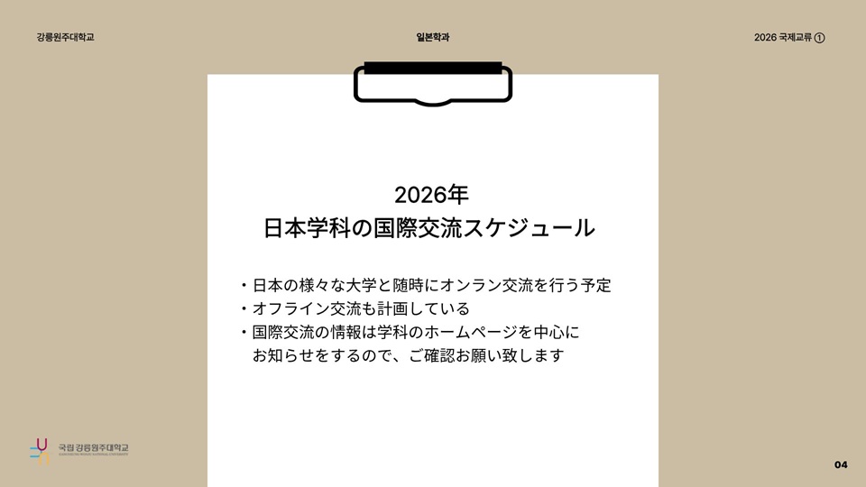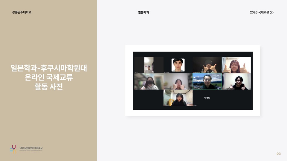fnctId=bbs,fnctNo=736 [국제교류] 2026 후쿠시마학원대학 온라인 국제교류 보고서 글번호 328196 작성일 2026.03.06 작성자 엄태봉 조회수 478 첨부파일 첨부파일이(가) 없습니다.