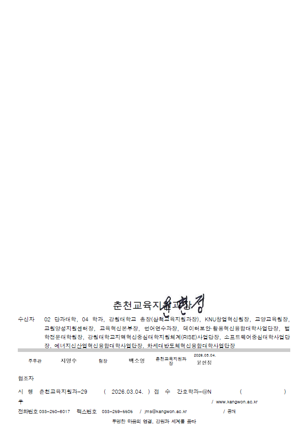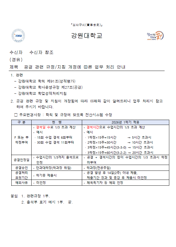 fnctId=bbs,fnctNo=840 공결 관련 규정 및 지침 개정에 따른 공결 제출 절차 안내(서식 포함) 사항입니다. 작성일 2026.03.04 작성자 원민정 조회수 490 공결 관련 규정 및 지침 개정에 따른 공결 제출 절차 안내(서식 포함) 사항입니다. 주요변경사항 확인 바랍니다. 첨부파일 공결 관련 규정_지침 개정에 따른 업무 처리 안내.pdf 1.공결관련규정.hwp 출석부표기예시.hwp